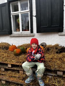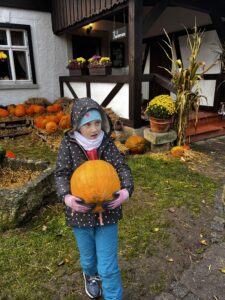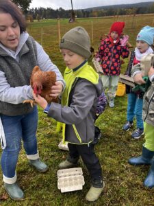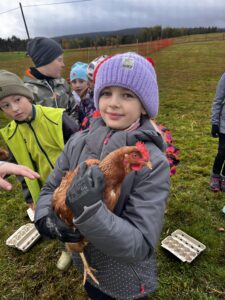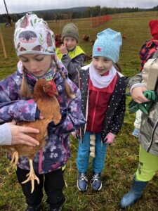 Poté se děti seznámily se slepičkami – dozvěděly se, jak je o ně třeba pečovat, a některé si je dokonce mohly pochovat. Na závěr si každý vybarvil vlastní miniaturu dýně ze sádry – krásná památka na podzimní den plný zážitků!